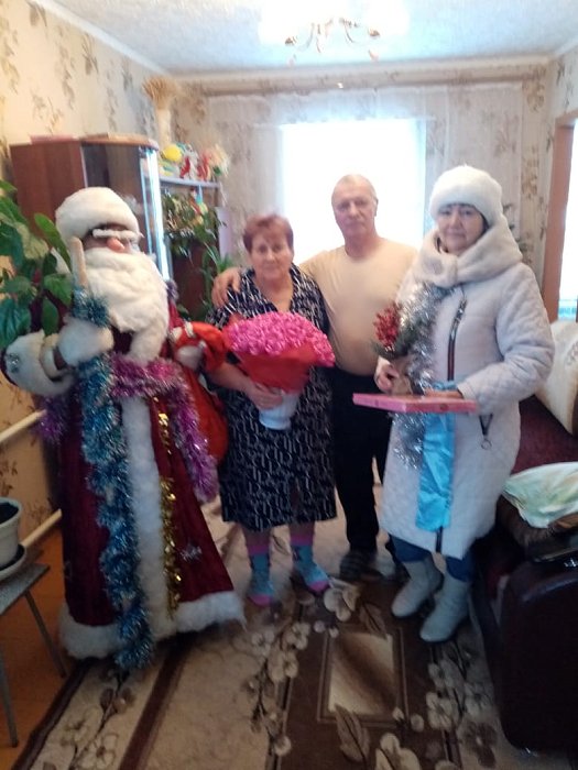 Поздравить юбиляров пришли настоящие волшебники – Дед Мороз и Снегурочка, в которых предстали Алла Жакупова и Нина Петрова. Они вручили паре душевный подарок и сказали самые теплые слова, которые наверняка тронули сердца Сергея Ивановича и Татьяны Геннадьевны.